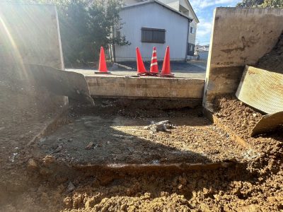 駐車スペースのコンクリートには深い亀裂が入り、地割れのように地盤が下がっていたため、まずは外構と傷んだ基礎をすべて解体・撤去するところからスタート。