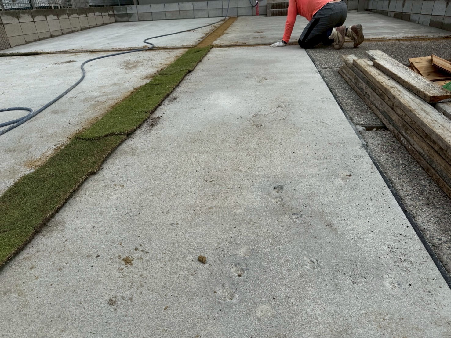 乾きかけのコンクリートの上をペットたちが歩いて、テクテクと足跡がついた唯一無二の仕上がりになりました。